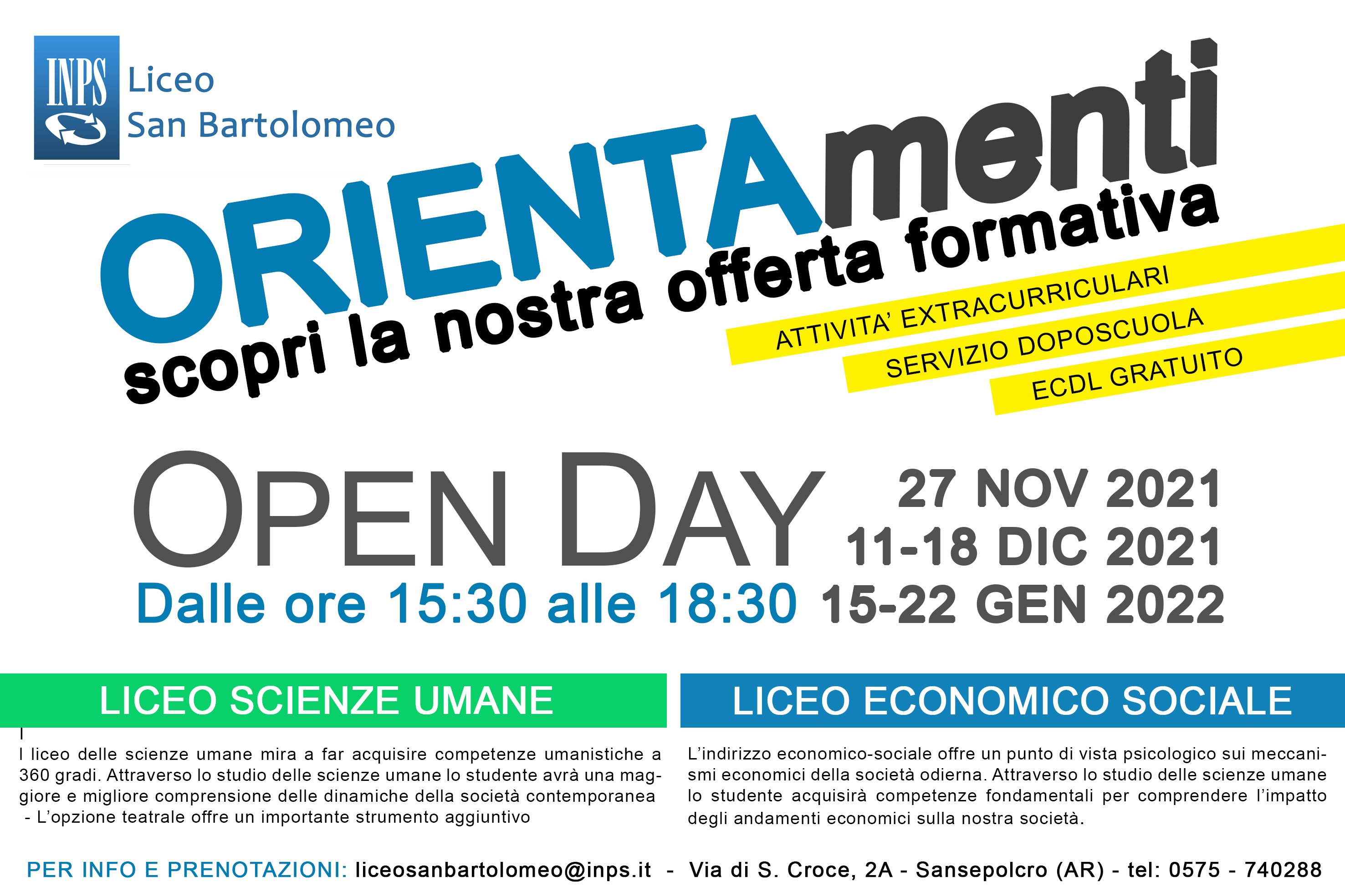 Scopri l'Offerta Formativa del Liceo San Bartolomeo per l'anno scolastico 2022/2023: prenota la partecipazione ad uno degli Open Days in calendario.